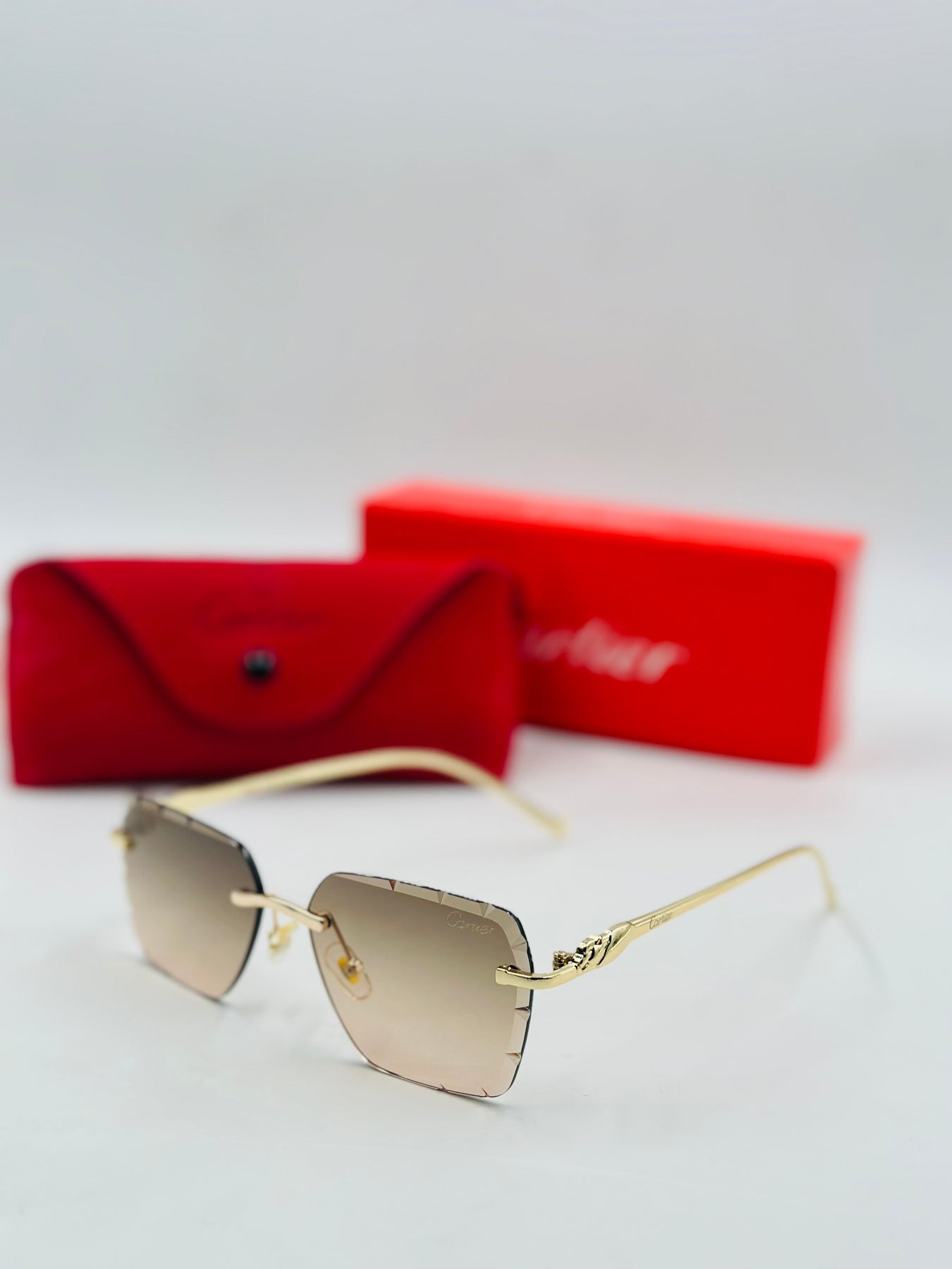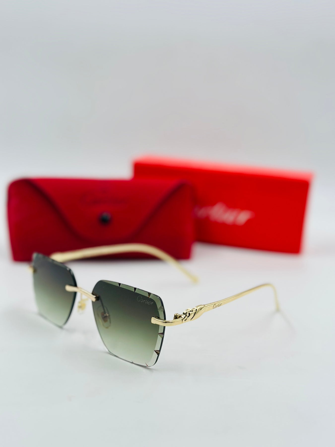 "Upgrade your eyewear game with Cartier's Rimless Luxury Sunglasses. Featuring a sleek and trendy design, these sunglasses combine golden brown and green shades for a unique and stylish look. Complete with a premium box, this is the ultimate accessory for the fashion-forward individual."